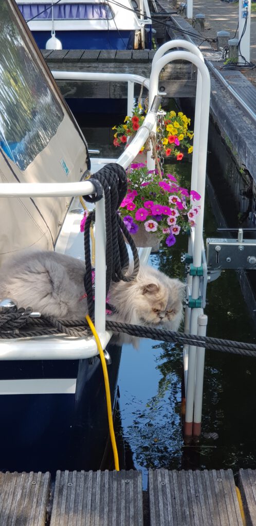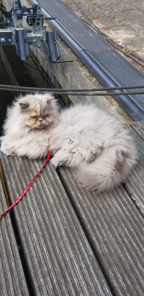 Da der Hafen ‚t Hooge Holt eine lange Kade vor dem eigentlich Hafen hat, haben wir uns keine Gedanken um einen freien Liegeplatz gemacht, zumal ja eigentlich schon die ganzen Tagen nichts los ist. Aber diesmal haben wir Pech, denn an der Kaded ist bereits alles belegt, obwohl Platz für ca.15 Schiffe ist. Später stellen wir fest, daß da kaum Bewegung ist. Möglicherweise sind die meisten auch Hafenlieger, nur liegen eben auf den Außenplätzen. Auch im Hafen gibt es Probleme, da es sich um einen kleinen Hafen handelt und eigentlich auch dort kein Platz mehr ist. Mit einigem Hin und Her und 2 gescheiterten Anlegeversuchen an ungeeigneten Plätzen, schaffen wir es dann rückwärts in eine Box zu kommen. Schlauchboot musste dafür mitten im engen Hafen abgemacht und nach vorne bugsiert werden. Ganz schön viel Stress und Aufregung, aber Stephan hat es souverän gemeistert. Wir haben auch sehr nette Nachbarn mit einer ziemlich aristrokatisch wirkenden Perserkatze.