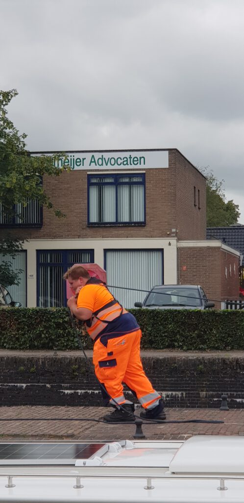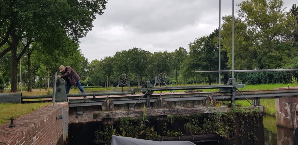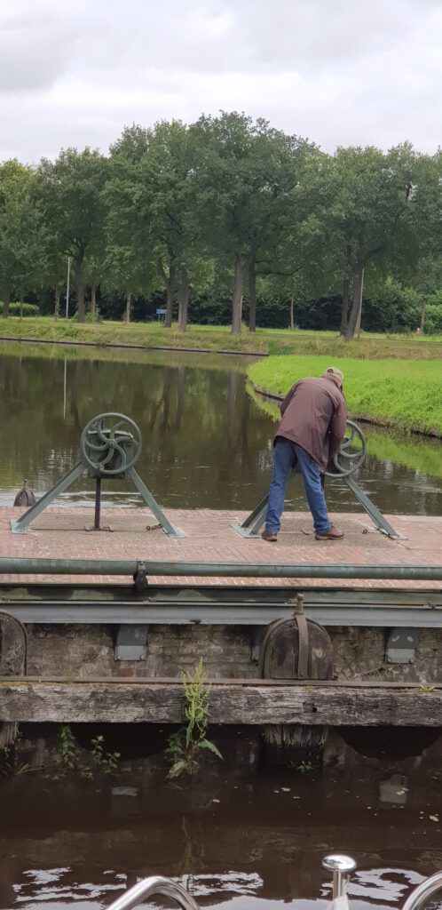 Heute ist es ziemlich kühl und es ist gut, daß wir heute geschlossen fahren können. Die Fahrt ist wieder sehr schön, aber für Stephan auch ziemlich anstrengend. Die Brücken und Schleusen sind wieder ganz schön eng und Stephan muss schon häufig genau zirkeln. Wir kommen nur mit 5 km/h voran, da es sehr viele bewegliche Brücken gibt, die von den Brückenwärter alle manuell auf – und zugemacht werden. Dann geht’s, meist per Fahrrad weiter zur nächsten Brücke. Das ist auch für die Jungs ganz schöne Knochenarbeit.