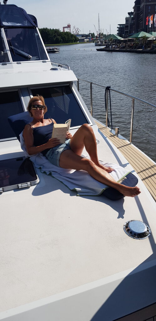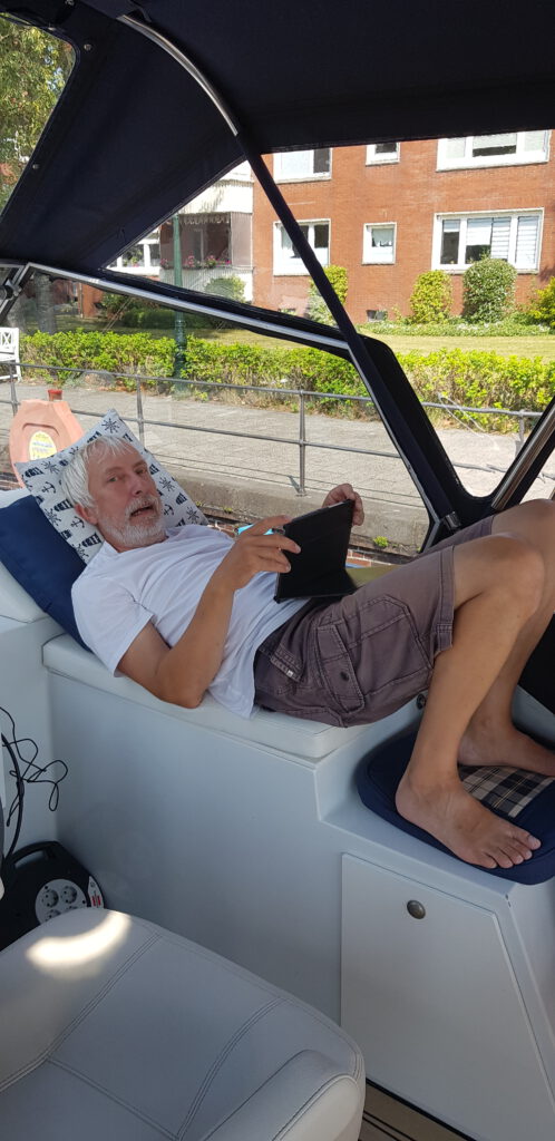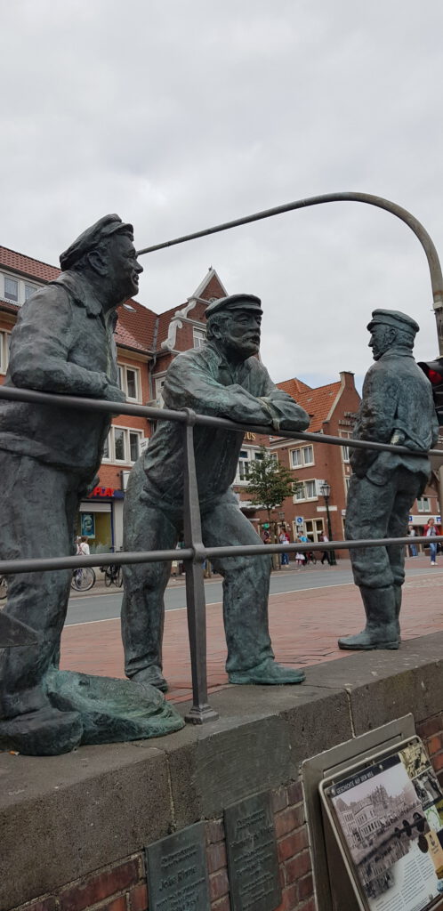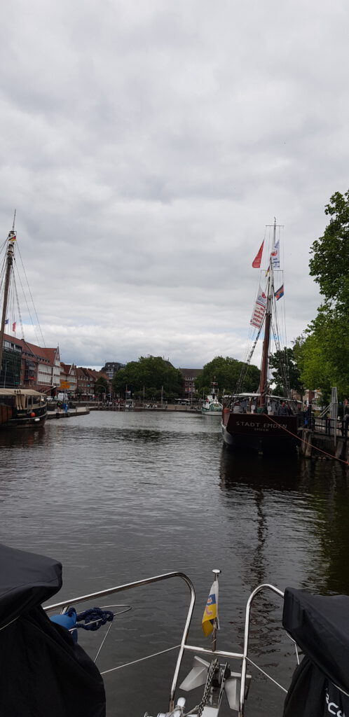 Es ist zum Glück eine völlig entspannte Überfahrt nach Emden. Kaum Wind und keine Wellen. Die Schleusenwärter der Seeschleusen hüben wie drüben sind total nett und die Schleusen sind harmlos. Auch hier in Emden ist der Funkton sehr locker. Sowohl die Nesselander Schleuse, als auch die Eisenbahnbücke dahinter halten sich an die vorgegebenen Schleusen- bzw. Öffnungszeiten. Die Kade vom Stadthafen ist so gut wie leer und wir bekommen einen schönen Platz direkt hinter dem Museumsschiff „Stadt Emden“. Das Wetter ist leider mehr bewölkt als sonnig, aber zumindest ist es trocken. Gegenüber gibt es sogar einen Beachclub.