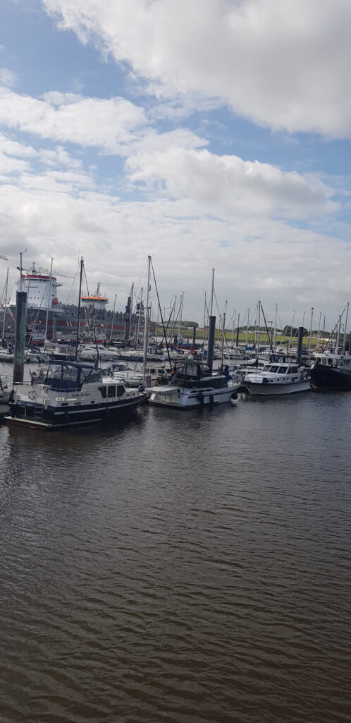 Vom Seehafen bin ich etwas enttäiuscht. Wir haben Glück und erwischen quasi den letzten Platz unterm Hafenbüro. Es ist recht laut, da nicht weit von uns die großen Containerschiffe liegen. Aber auch im Hafeninnenberereich ist es nicht sehr viel besser. Man schaut entweder auf eine Spuntwand oder auf Containerschiffe. Ganz wenige Plätze haben einen freien Ausblick auf den Zeehavenkanaal. Zu 90 % liegen hier Segler. Auch die Vermutung, daß man von hier aus nicht mal eben zum Strand kommt, bestätigt sich. Man ist allerdings direkt in der Stadt.
