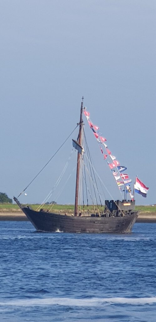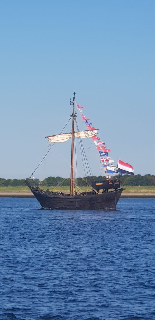 Unterwegs auf der Oosterschelde begegnet uns eine Historische Hansekogge. Am WE ist in Zieriksee ein Treffen Historischer Koggen.