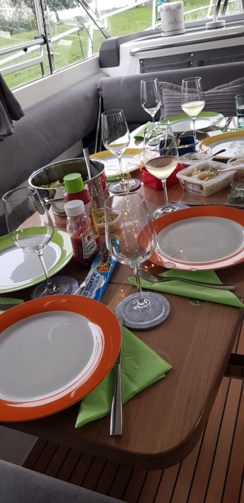 Die Berufsschiffer liefern sich zeitweise mal wieder ein richtiges Elefantenrennen auf der Maas. In die Schleuse Belfeld können wir dann ohne große Wartezeit einfahren. Das Wetter bleibt leider unbeständig mit viel Wind, aber wir schaffen es noch rechtzeitig bei trockenem Wetter bis nach Neer. 20 min. später gibt es einen heftigen Regenschauer. Wir verbringen einen netten Spielenachmittag auf der Aquila und am Abend wir bei uns gegessen.