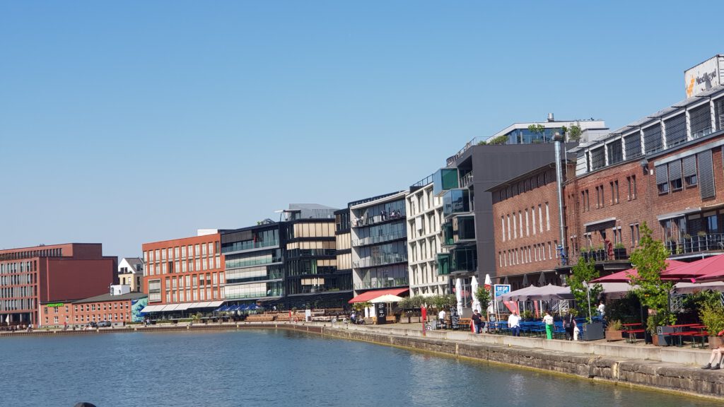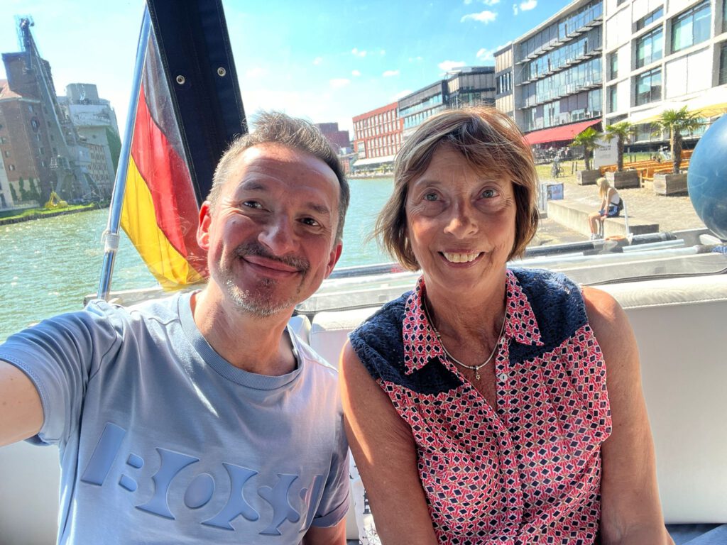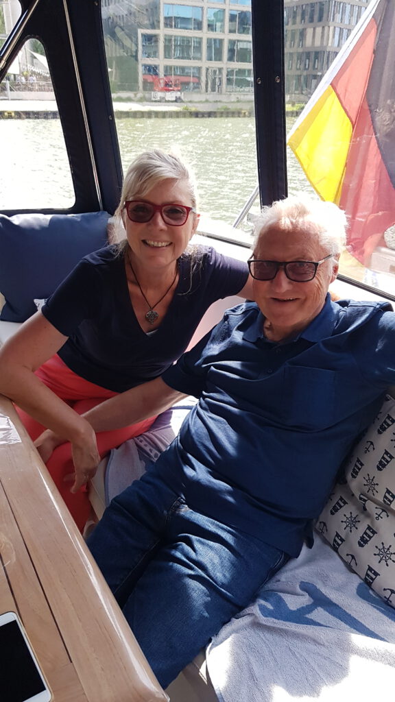 Wir verlassen den idyllischen Hafen und machen uns auf nach Münster. Kurz danach wechseln wir auf den Dortmund-Ems-Kanal. Von unterwegs telefonieren wir mit dem Hafenmeister, der uns grünes Licht für die Übernachtungen gibt. Normalerweise gibt es wohl ein Agreement mit der Stadt, dass man für 1-2 Nächte bleiben kann, aber diese Woche ist nichts los. Die Flußfahrtschiffe kommen erst am WE. Es ist zwar etwas ungastlich hier, sprich weder Strom noch Wasser und das Befestigen ist auch nicht so einfach, aber wir glauben, daß ist so gewollt. Schiffe sind wohl von den Münsteraner nicht unbedingt erwünscht. Die finden es gibt eh zu viel Tourismus in der Stadt. Natürlich ist es auch nicht besonders ruhig hier, da sich in den letzten Jahren an der Kade viele Lokale und Büros angesiedelt haben. Auf der gegenüberliegenden Seite wird gebaut, so daß wir tagsüber den Baulärm hören. Aber andererseits gibt es somit auch immer etwas zu sehen. Direkt um die Ecke gibt es einen Aldi und einen großen Edeka. Beide sind super sortiert. Aber am Nachmittag bekommen wir unerwarteten Besuch von dem Schweizer Schiff „Kira“, welches wir an der Schleuse getroffen hatten.n Rolf, Leonie und Bernadette wollen bis nach Cuxhaven und von dort weiter. Sie liegen in der Marina Fuestrup, welches sie uns warm ans Herz legt. Vielleicht dann auf der Rücktour. Da jetzt einen Zwischenstopp einzulegen lohnt bei 11 km Entfernung nicht wirklich. Vielleicht sieht man sich ja unterwegs nochmal.