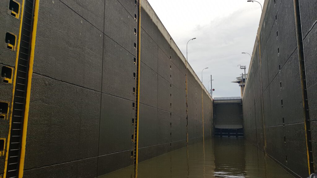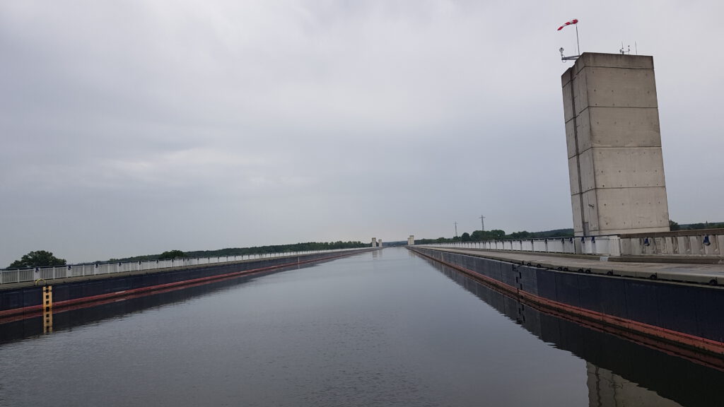 Nach dem super Wetter gestern regnet es heute. Wir sitzen startklar und warten, dass der heftige Schauer nachlässt. Kurze Zeit später erreichen wir die Trogbrücke. Die Kanalbrücke Magdeburg hat, zusammen mit der Schleuse Hohenwarthe, eine Länge von 5 km und ist somit die längste Kanalbrücke der Welt. Zum Glück hat der Regen aufgehört, denn das Schleusen dauert etwas länger. Der Hub beträgt fast 15 m, aber auf der Stb. Seite befindet sich Schwimmpoller.
