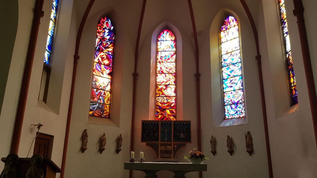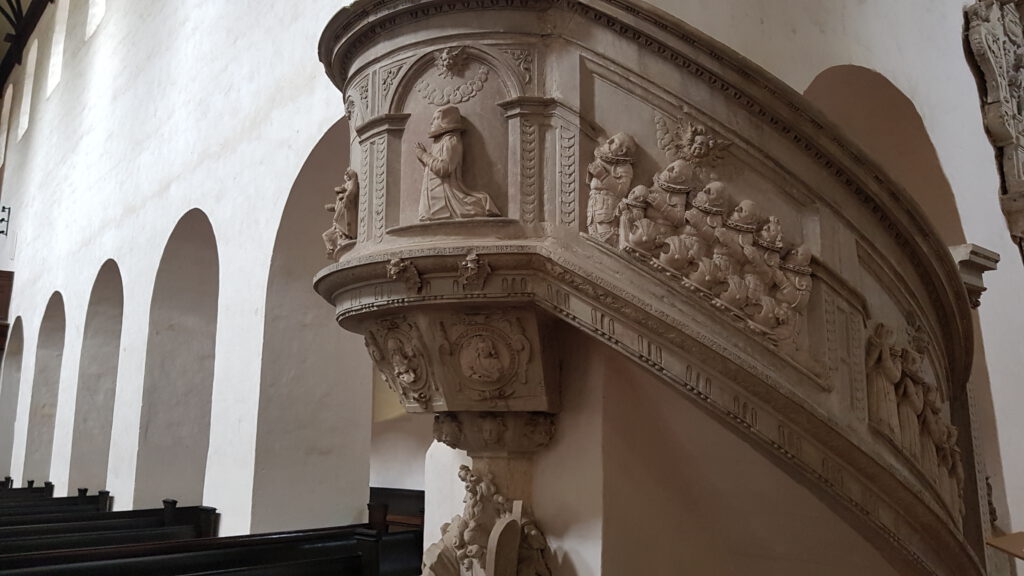 Nach 2 Std. machen wir schon wieder bei Burg an einem Anleger fest. Die Sonne setzt sich durch und wir wollen uns mal wieder etwas bewegen und einkaufen. Burg ist nicht sehenswert, hat aber Edeka und Rossmann und etwas weiter draußen Aldi und Toom. Es gibt zwei Kirchen im Ort, wobei die Kirche St. Johannes der Täufer drei wunderschöne Glasfenster über dem Altar hat. Die St. Nicolaikirche besitz eine Kanzel von 1640, deren Reliefarbeit sehenswert ist. Ansonsten sind beide Kirchen mehr als schlicht gehalten.
