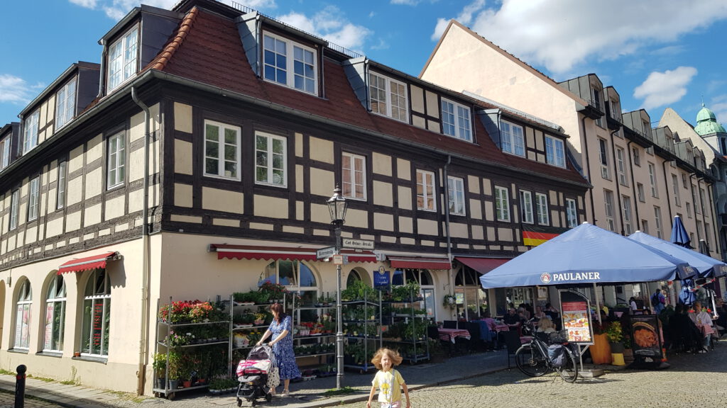 Hauptsächlich haben wir den Hafen genommen, weil in der Nähe ein Waschsalon ist. Während wir also 3 Maschinen laufen lassen, wird das Wetter immer sonniger. Anschließend machen wir uns auf den Weg zur Zitadelle und kommen dabei auch durch die Altstadt von Spandau. Die ist allerdings eher modern, aber groß und ansehnlich.