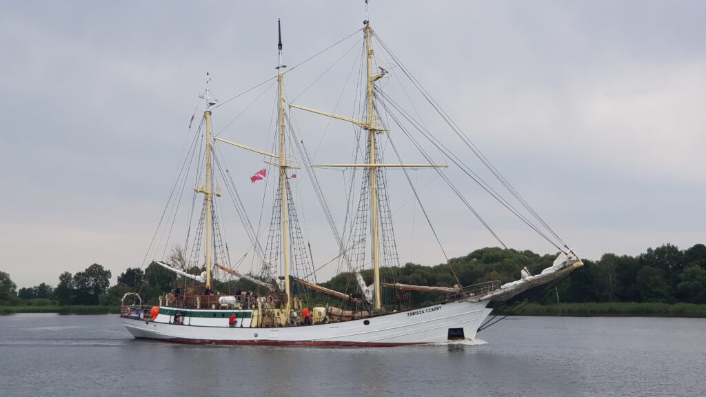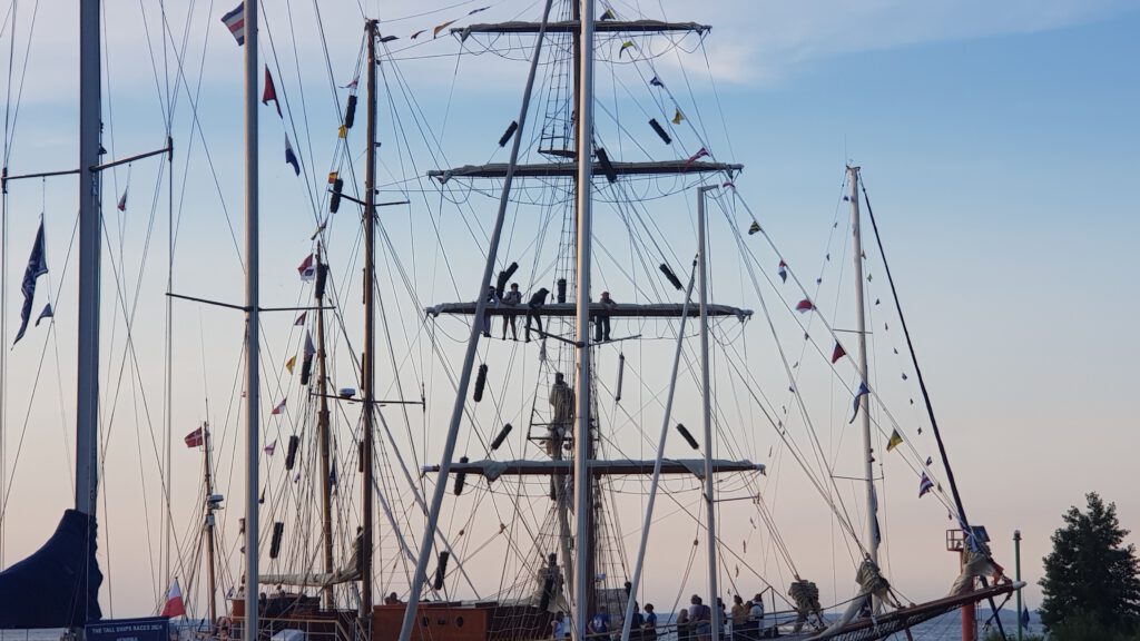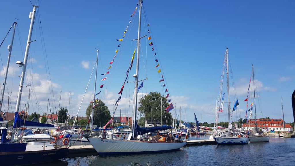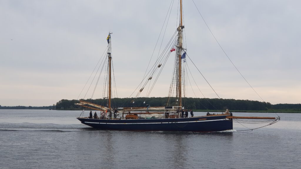 Wir fahren bei wenig Wind los und haben eigentlich vor zu ankern. Nach ca. 1 ½ Std. bekomme ich eine echte Krise. Hunderte von kleinen Fliegen sitzen auf dem ganzen Boot im Windschatten. Sie bleiben nicht da sitzen, sondern setzten sich auch bei uns auf Körper und die Haare. Vor lauter Verzweiflung steuern wir den nächsten Hafen an, direkt am Übergang zum kleinen Haff gelegen in Trezbiez, deutsch auch Zíegenhort genannt. Von dem Hafen habe ich unterwegs auch schon mal gehört. Wir müssen in eine Box mit viel zu kurzem Steg, weil alle Plätze an der Mauer reserviert sind für die kleineren Segler der Tall Ship Race. Natürlich frischt gerade der Wind auf und wir haben echt Probleme festzumachen. Was mich allerdings etwas versöhnt: man sieht schon die Großsegler von der Tall Ship vorbeiziehen und auch hier im Hafen kommen immer mehr von den geflaggten Segler, die dran teilnehmen.