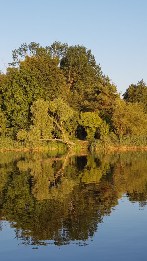 Sind eigentlich nur kurz ums Eck gefahren. Dieser Teich war früher eine 10 m tiefe Grube für den Tonabbau. Nachdem die Ziegleien aufgegeben wurde, hat man die Verbindung zur Havel wieder geöffnet und das Grundwasser nicht mehr abgepumpt. So ist der See entstanden, wie so viele entlang der Strecke nach Templin. Der Prerauer Stich ist aber fast die einzige frühere Abbauhalde mit einer Verbindung zur Havel und damit mit einem Boot erreichbar. Wunderschön – der See ist sauber und es ist sehr ruhig hier. Die Hitze lässt sich gut aushalten, da immer ein leichter Wind weht.
